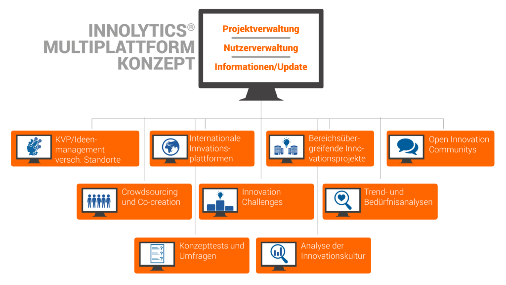 Das einzigartige Multi-Plattform Konzept macht die Innolytics® Innovationsmanagement Software zum Schweizer Taschenmesser für Ihr Innovationsmanagement. Eine gemeinsame Nutzer- und Plattformverwaltung – darunter unterschiedlichste Innovationsplattformen. Beispielweise:
